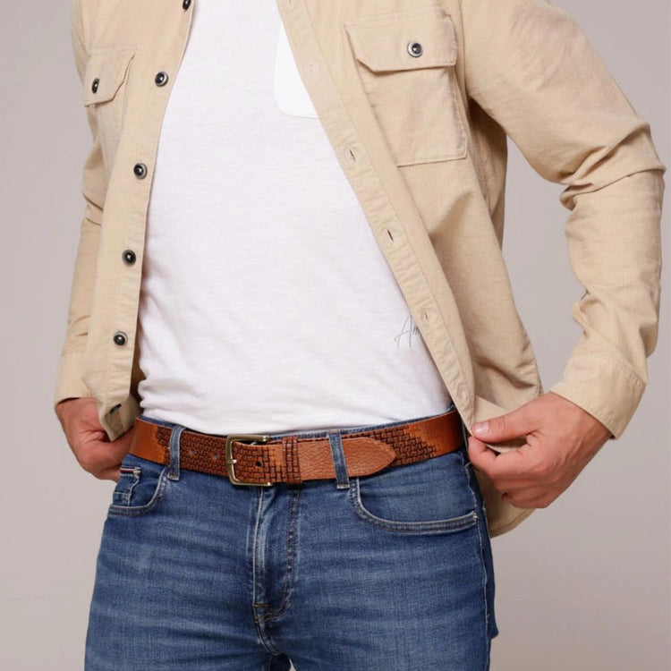 Discover the timeless charm of the Alvin leather belt, seamlessly transitioning between work and leisure. With its unique antique gold buckle and durable leather strap, the Alvin belt embodies classic everyday style. PRODUCT DETAILS Width: 1.38" Material: Full-Grain Italian Leather Buckle: Sourced from Italy, Nickel free...- £39.95