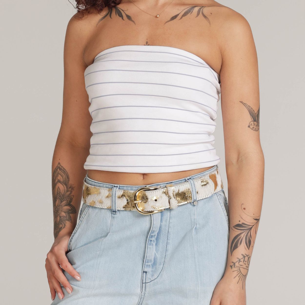 Traditional cow print just got an upgrade so moo-ve over because we're getting seriously obsessed with animal prints. Reinvented this time with metallic foil patterns, the Dakota belt lends an interesting definition to any outfit with its luxe calf hair and a curved shiny buckle.